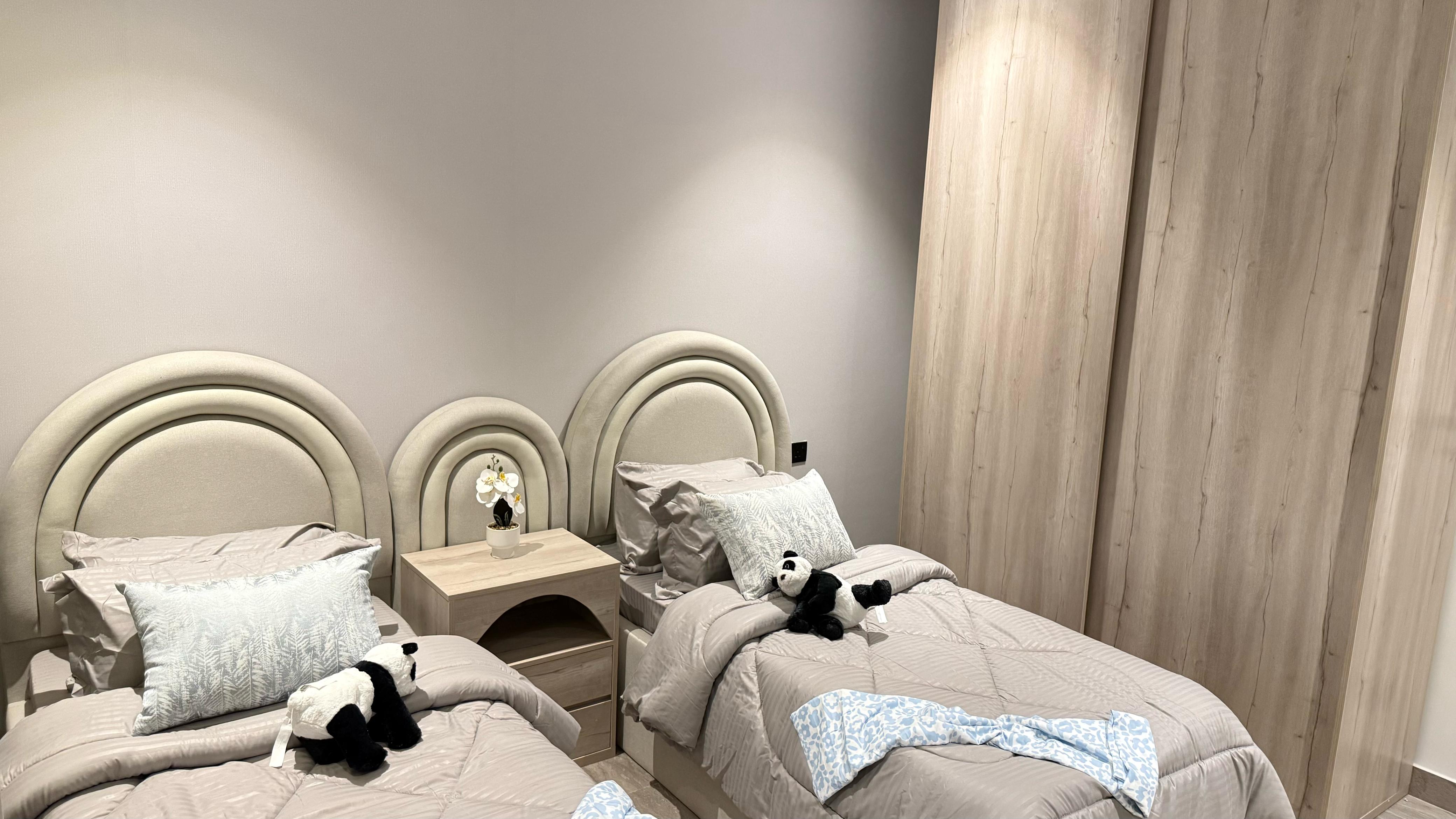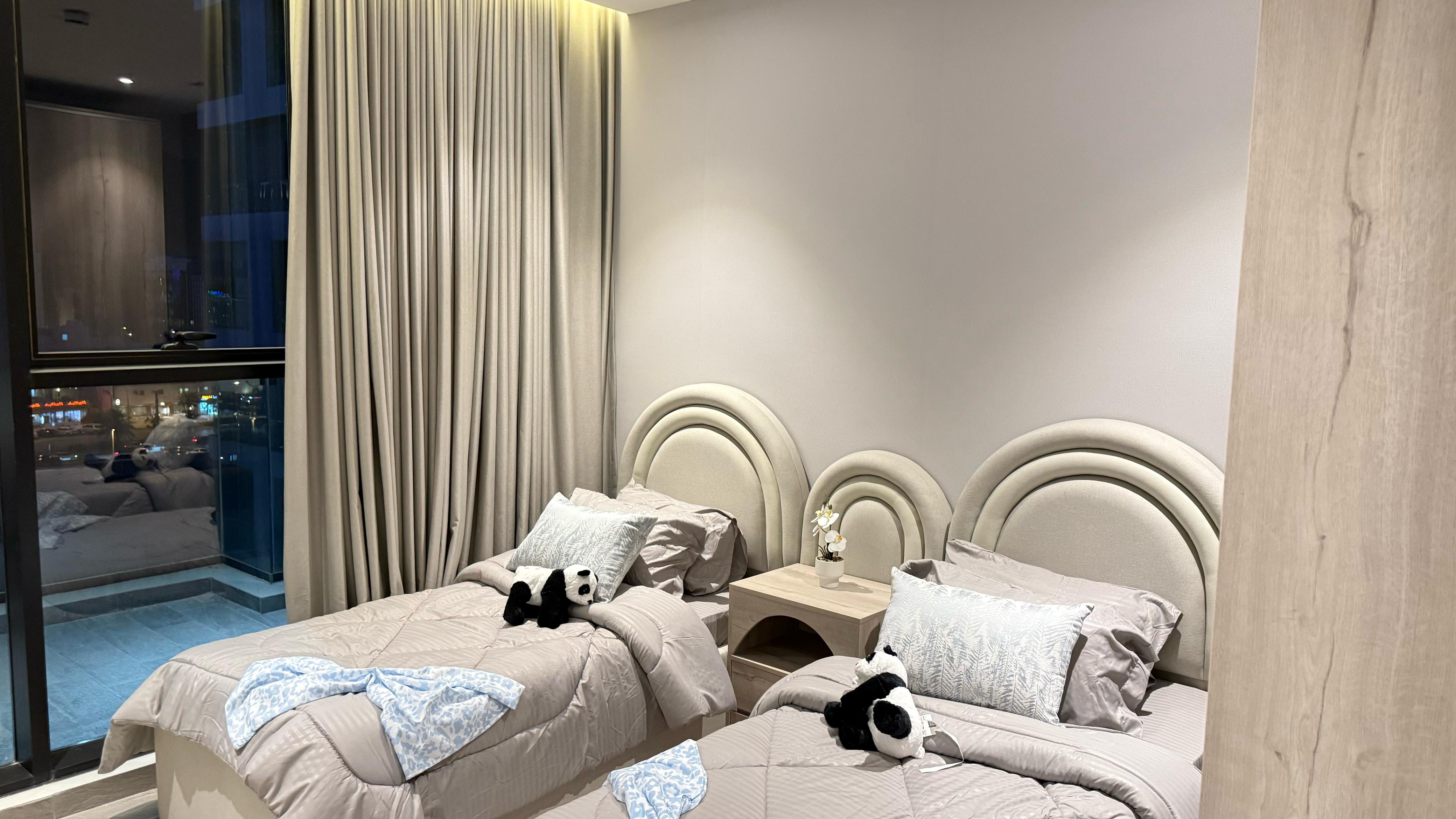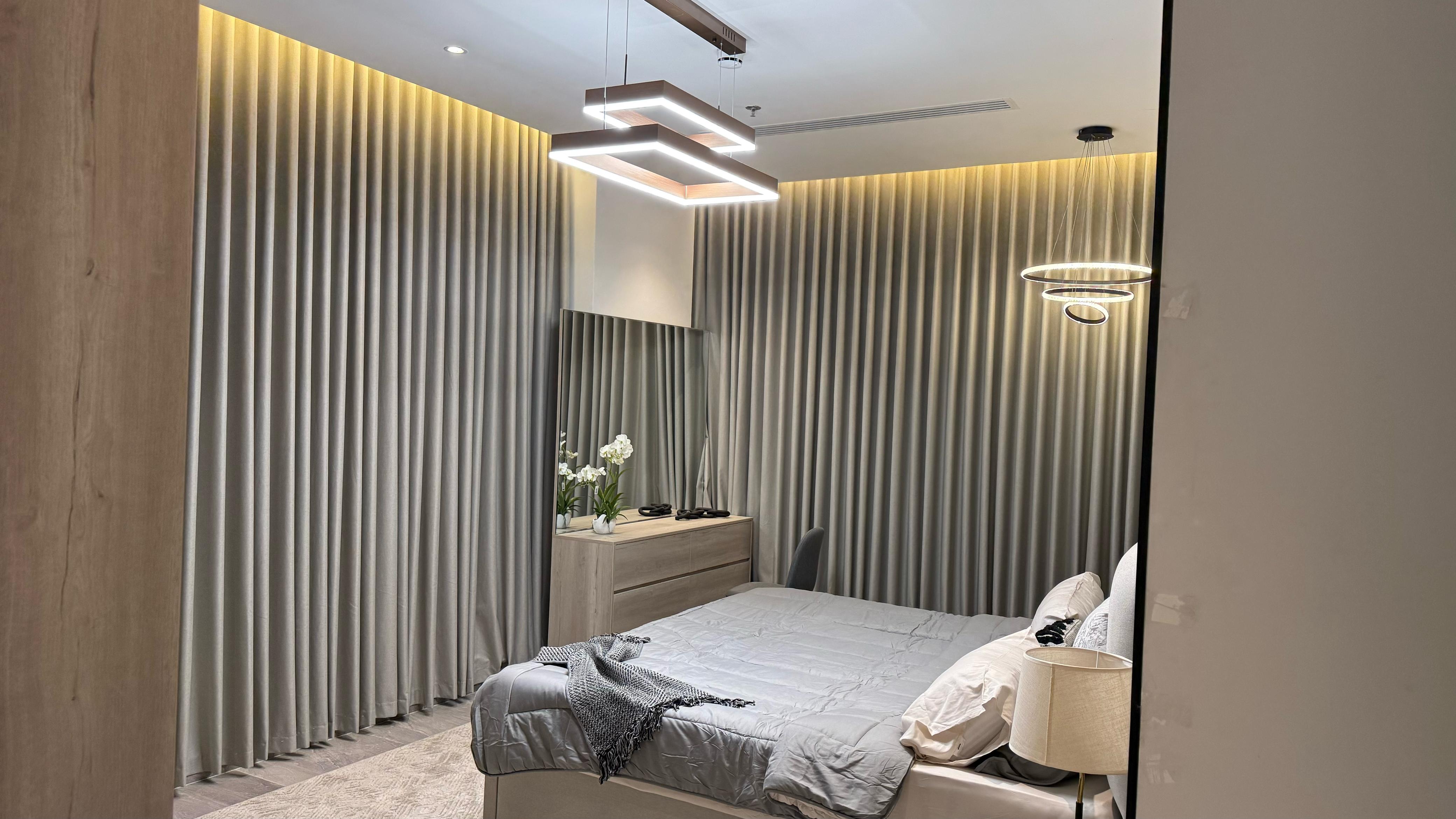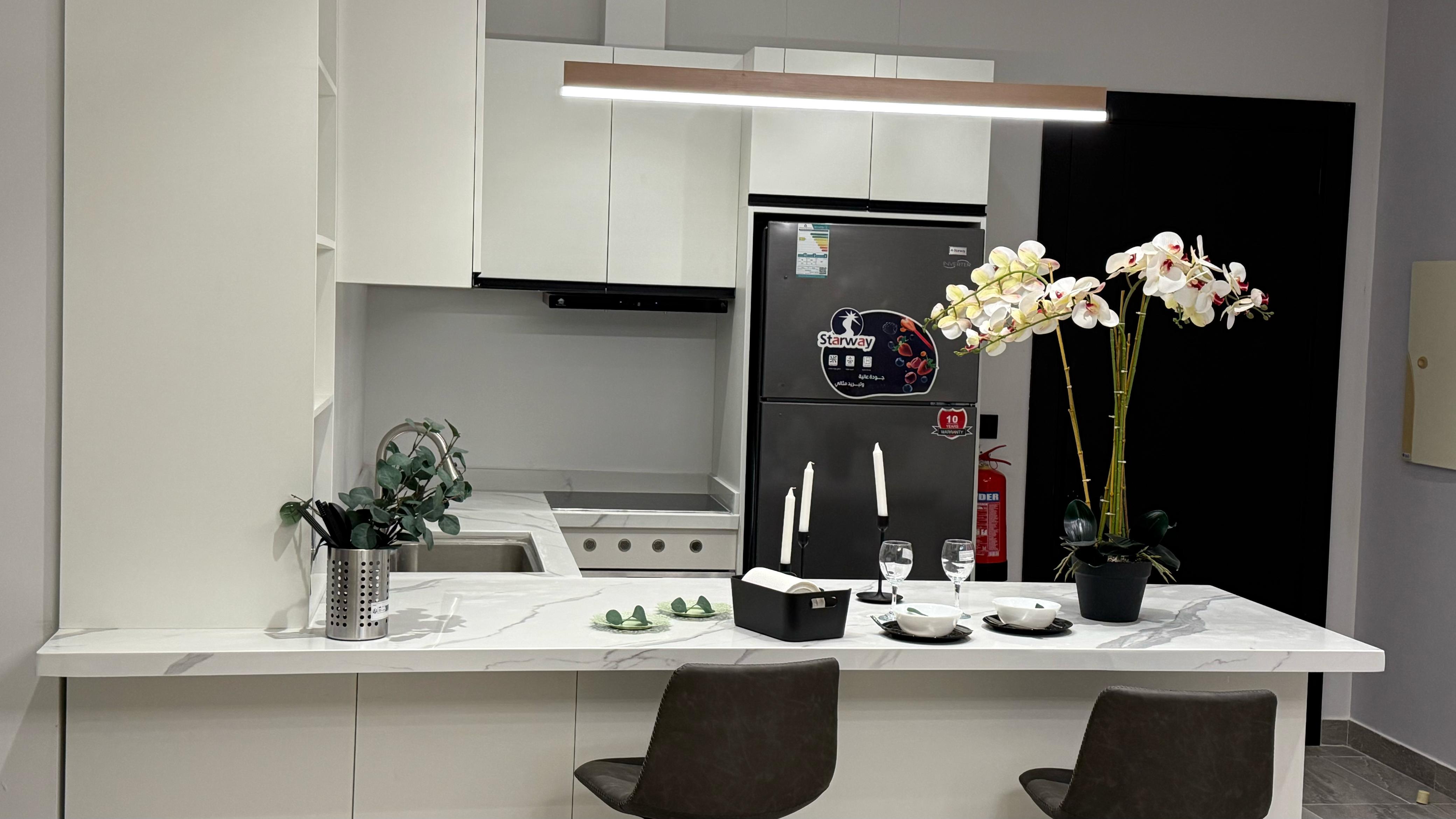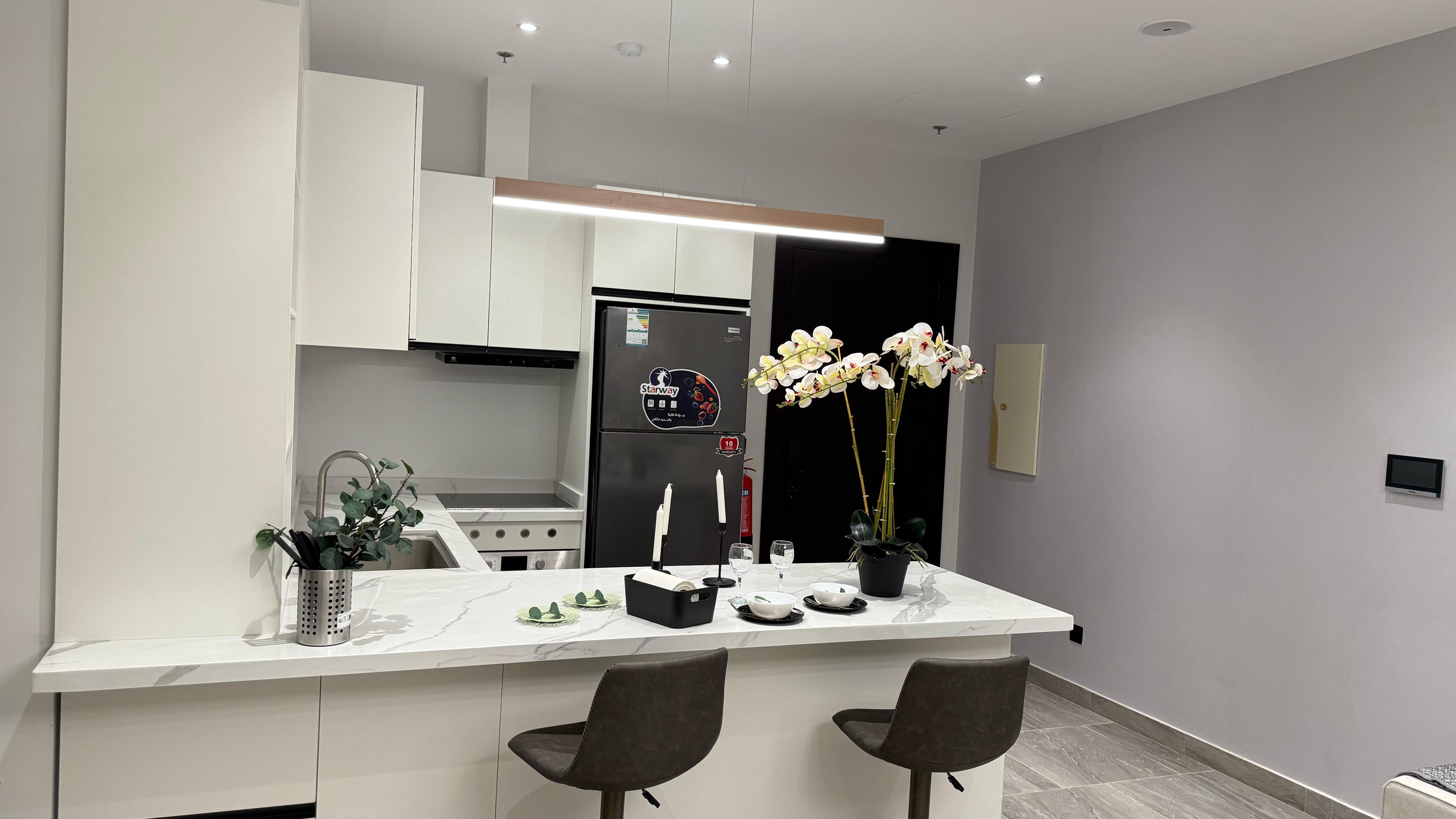 تفاصيل الوحدة : *2 غرف واحده ماستر *1 صالة واسعة *1 صالة طعام * 3 دورات مياه *1 مطبخ راكب بجميع الأجهزة * الوحدة موثثة بالكامل