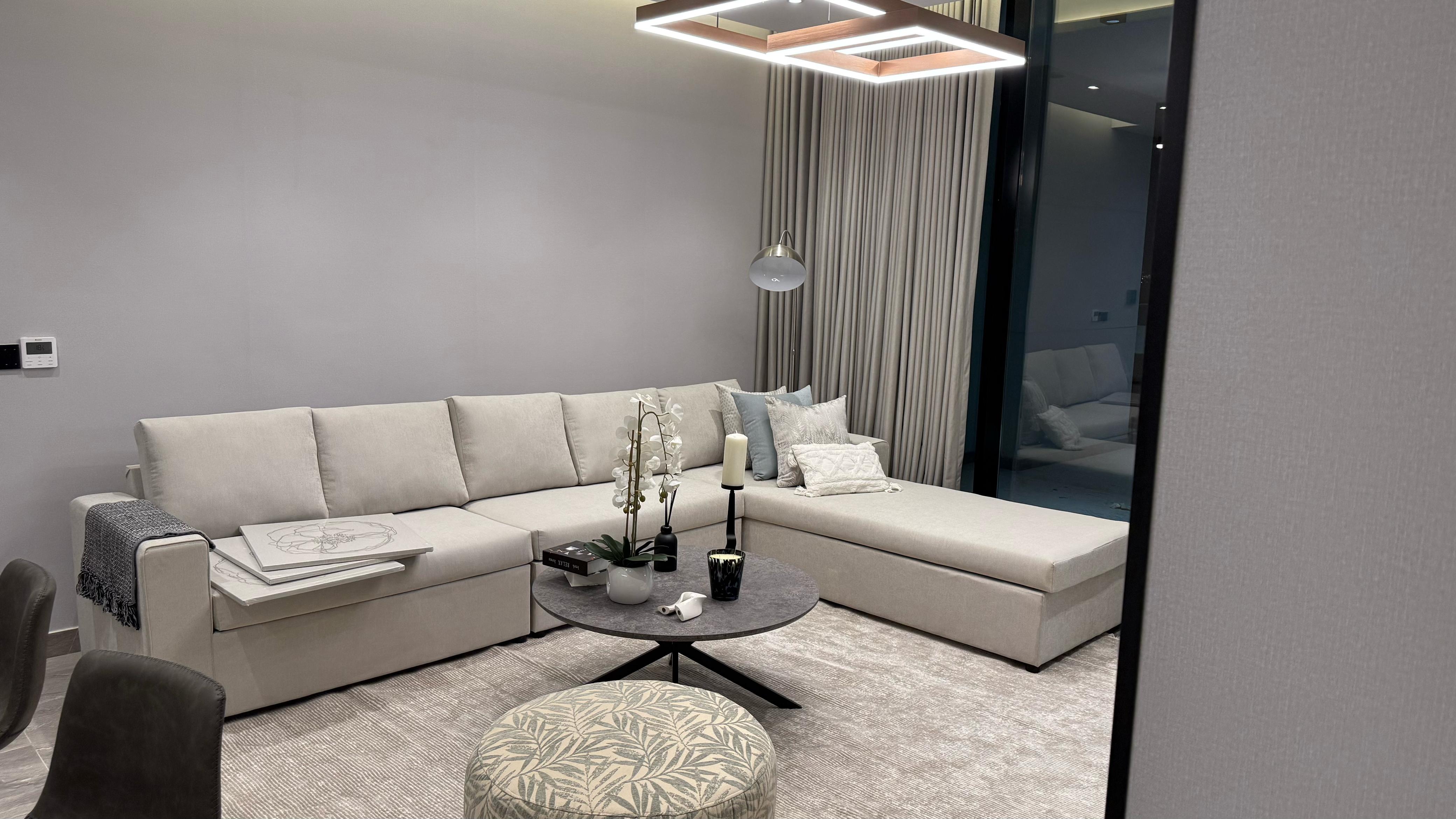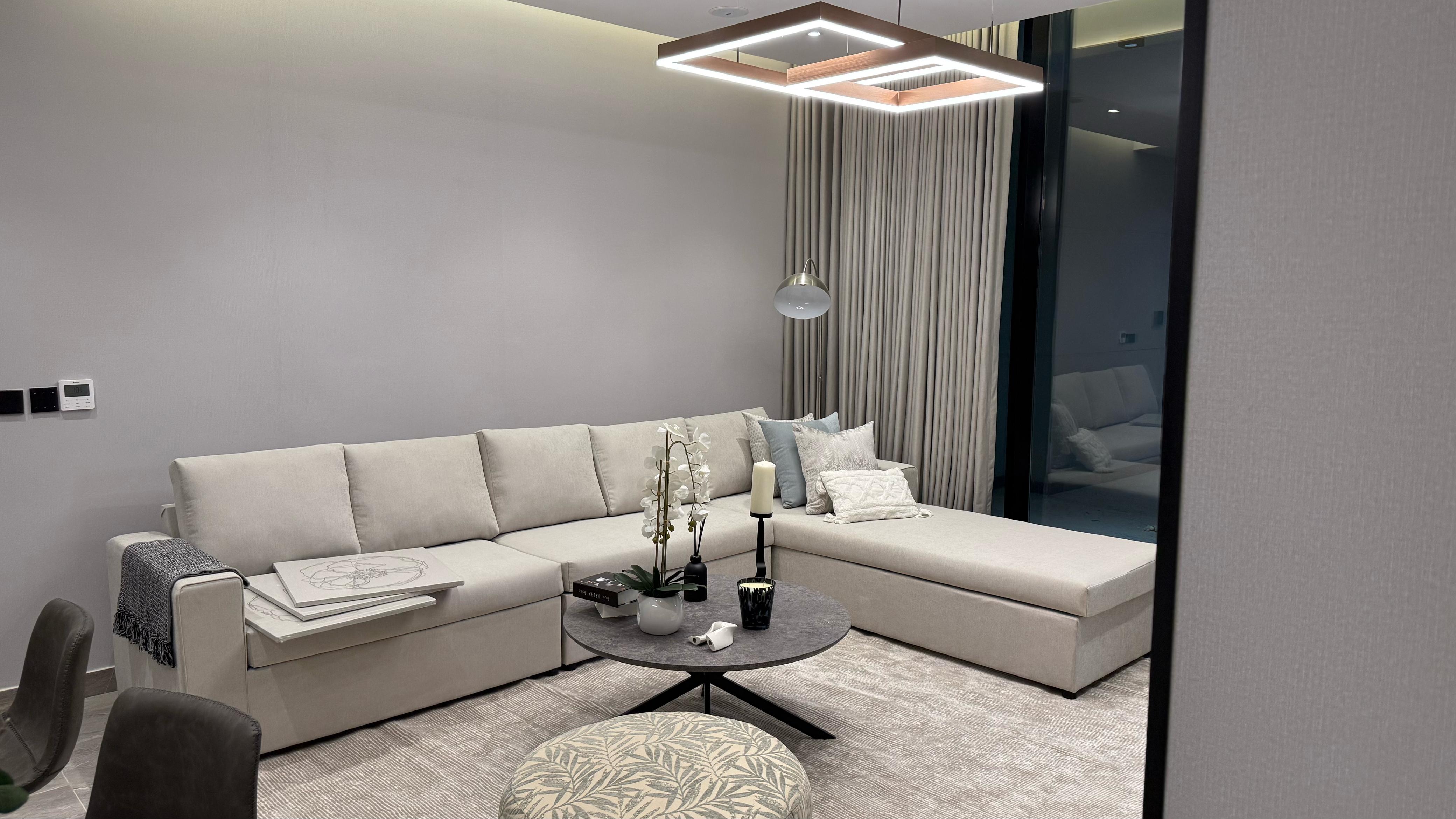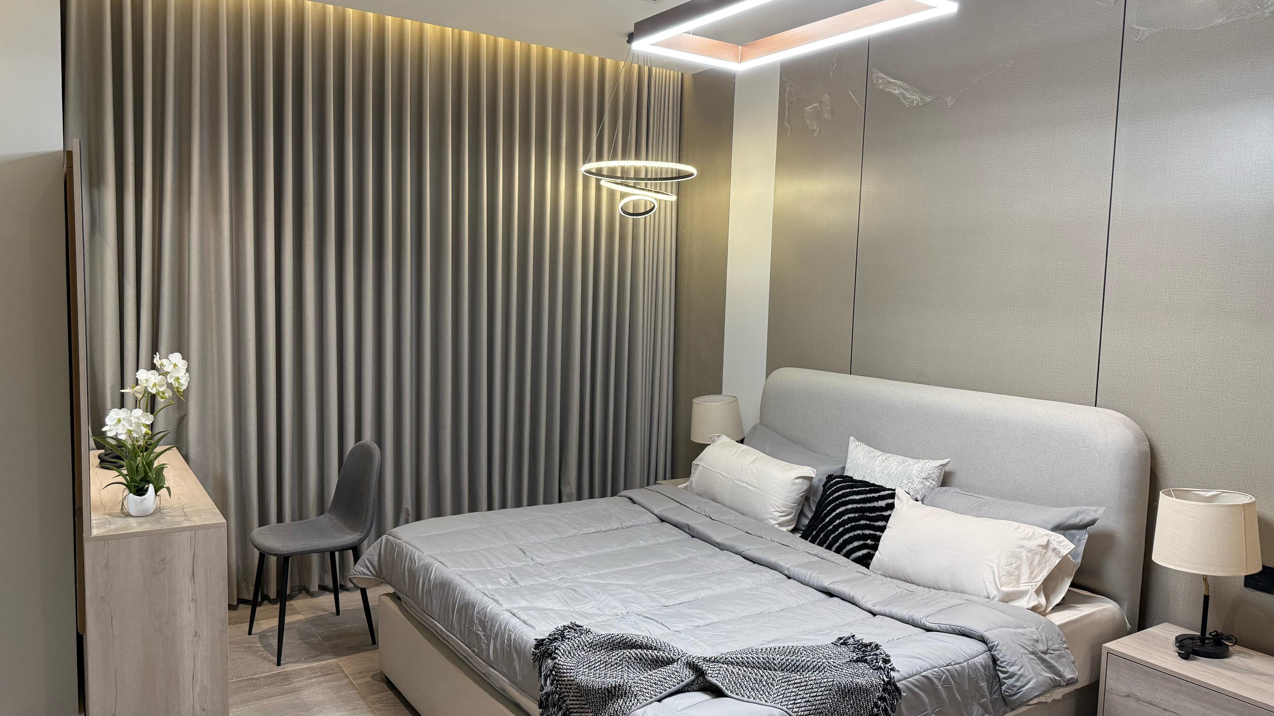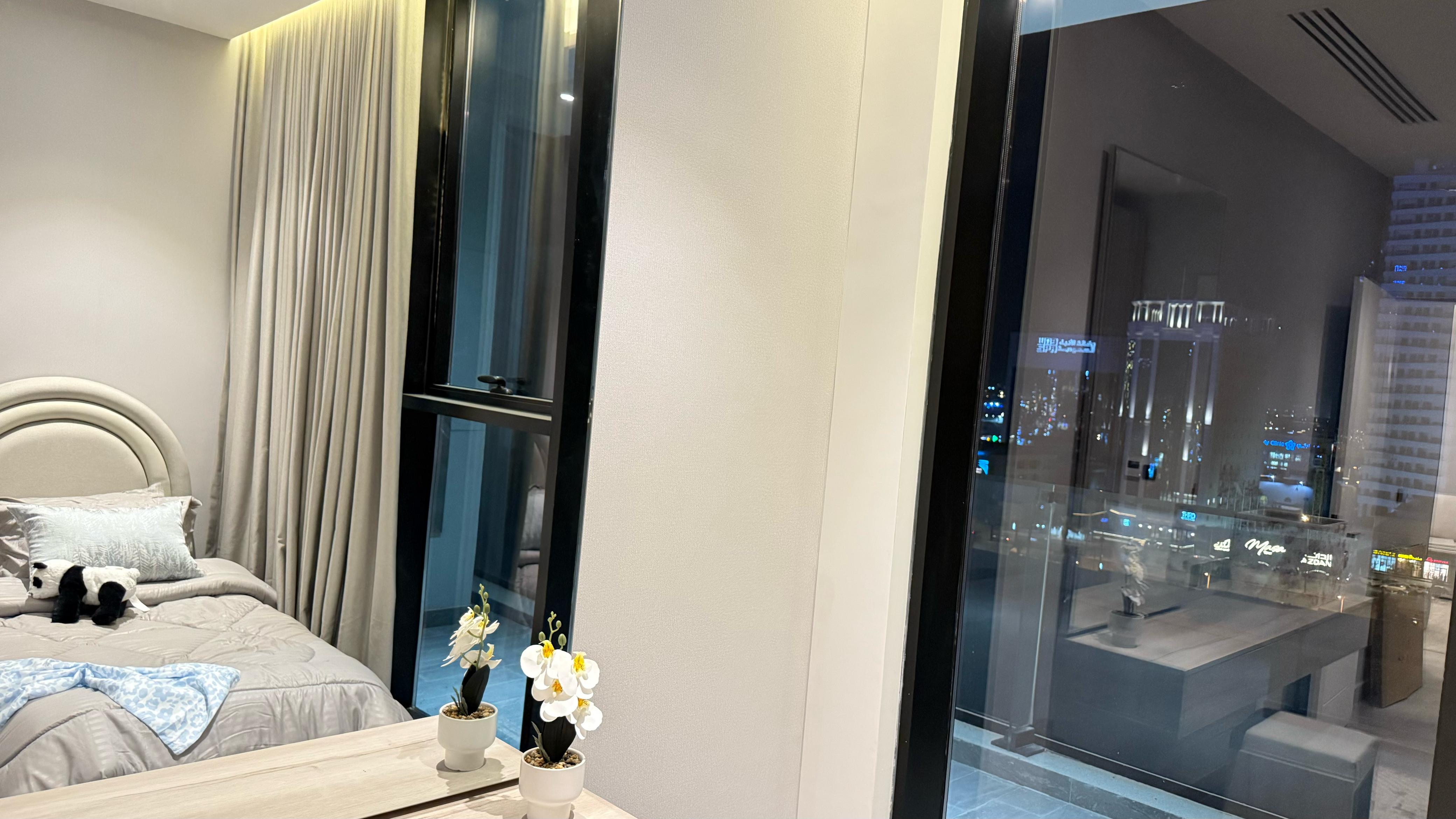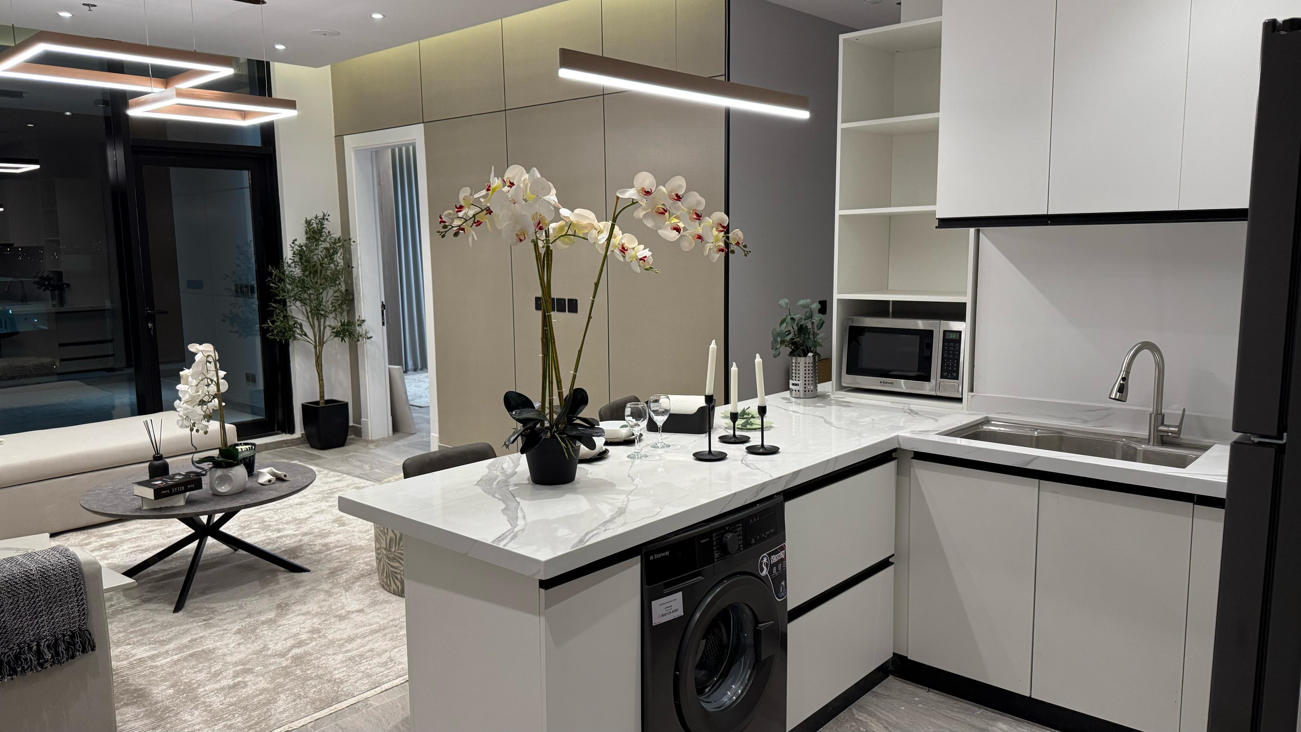تفاصيل الوحدة : *2 غرف واحده ماستر *1 صالة واسعة *1 صالة طعام * 3 دورات مياه *1 مطبخ راكب بجميع الأجهزة * الوحدة موثثة بالكامل